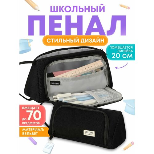 Пенал для девочек и мальчиков 3 отдела на молнии для школы, вельветовый