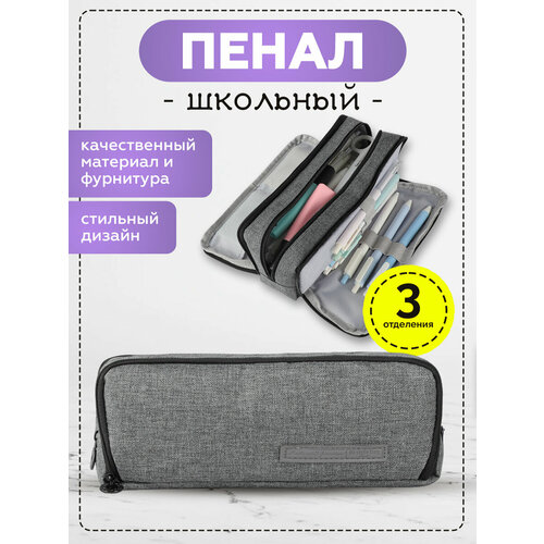 Пенал для девочек и мальчиков 3 отдела на молнии для школы, темно-серый