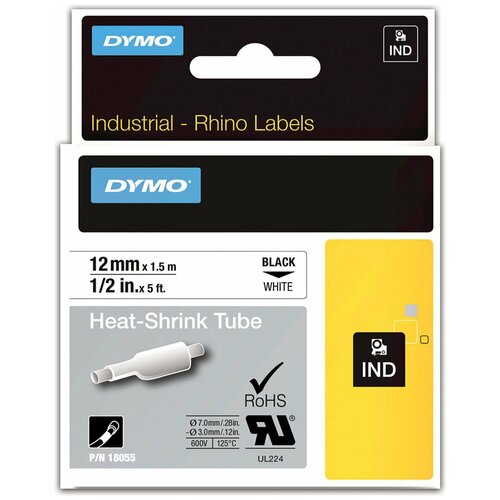 Картридж для принтеров этикеток DYMO Rhino, 12 мм х 1,5 м, термоусадочная трубка, шрифт, белая трубка, 18055