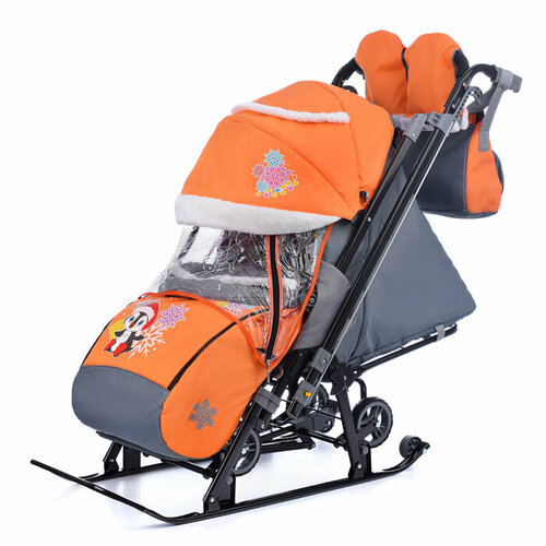 Санки детские с колесами - коляска зимняя GALAXY Кидс 1-2 (оранжевый пингвин)