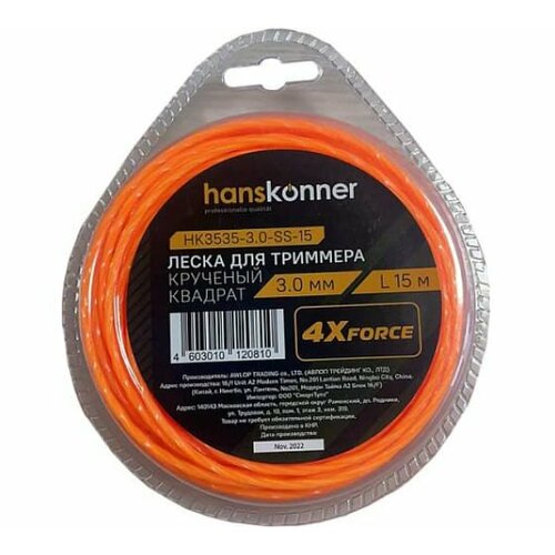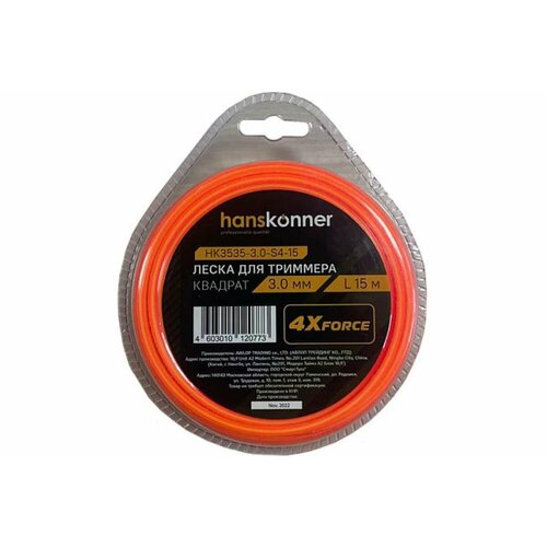 HK3535-3.0-S4-15 Леска для триммера, d=3,0мм l=15м, квадрат, блистер, Hanskonner
