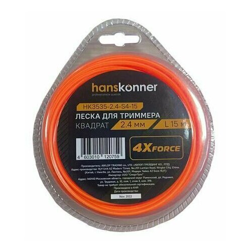 Леска для триммера Hanskonner HK3535-2.4-S4-15 d2.4мм, l15 м, квадрат, блистер