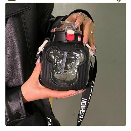 Стильный поильник с ремешком и кнопкой 900 мл /Черный Bearbrick