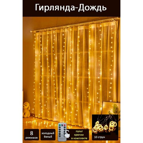 Электрогирлянда интерьерная Занавес Дождь 10 струн (энергосберегающая),3 м, питание от порта USB, с крючками