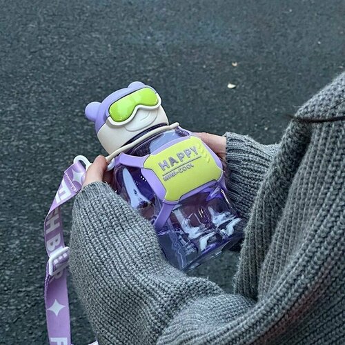 Стильный поильник с ремешком и кнопкой 800 мл / Сиреневый Медведь Bear