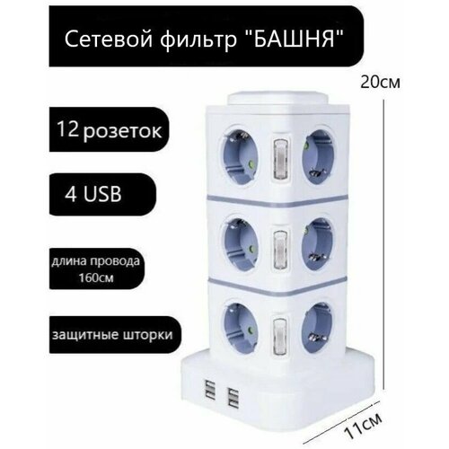 Сетевой фильтр удлинитель вертикальный на 12 розеток с USB, удлинитель башня