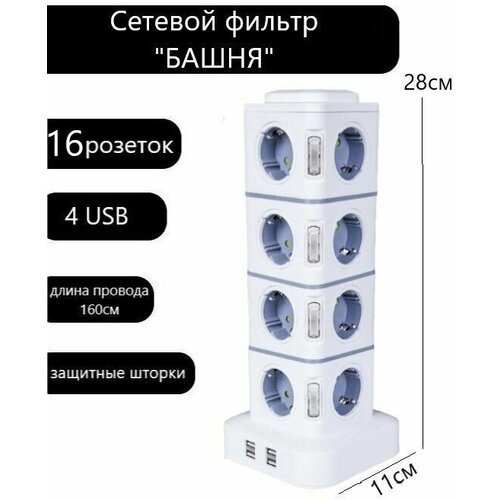 Сетевой фильтр удлинитель вертикальный на 16 розеток с USB, удлинитель башня