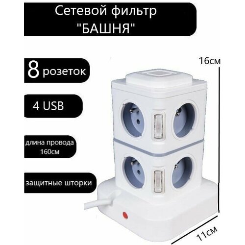 Сетевой фильтр удлинитель вертикальный на 8 розеток с USB, удлинитель башня