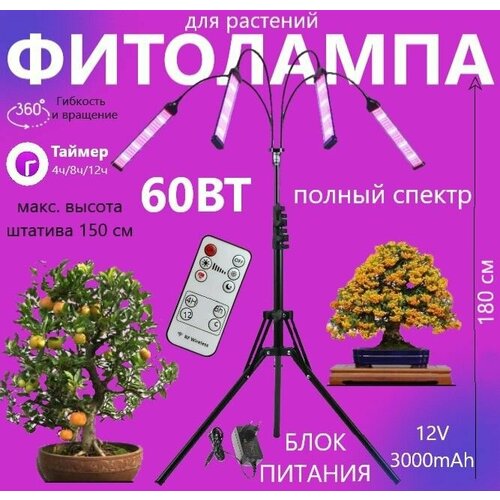 Фитолампа для растений светодиодная полного спектра / Лампа для рассады/ напольный фитосветильник на штативе