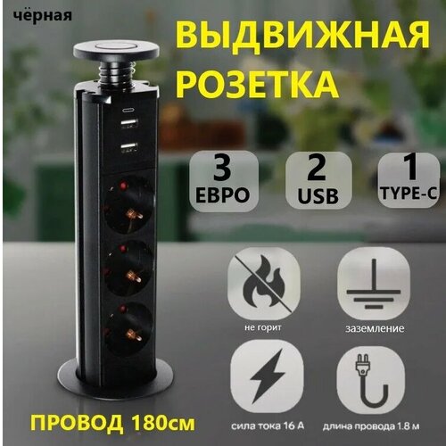 Встраиваемая выдвижная розетка для столешницы, розеточный блок, провод 1,8 м с вилкой, USB, скрытая, встроенная, стола, мебели, для кухни и офиса