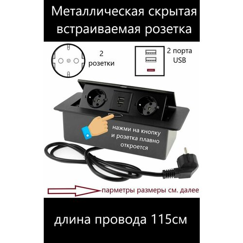 Встраиваемая скрытая розетка металлическая- удлинитель для столешницы, стола, мебели, для кухни и офиса