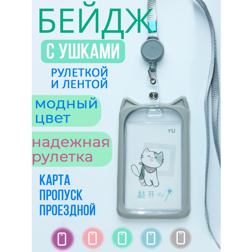 Бейдж с ушками Котик в силиконовой оправе, для пропуска, чехол для карты, с рулеткой на ленте, для аниме-карточки, для школьной карты. Детский. Серый.