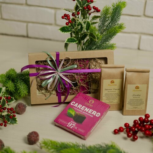 Подарочный набор из 2-х видов чая (Ассам + Брызги Шампанского) по 50 гр. и шоколада в кубиках