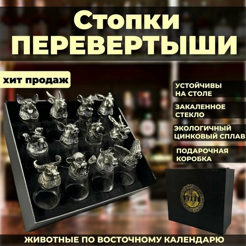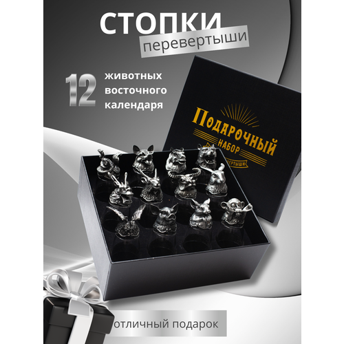 Набор рюмок с головами животных в коробке/ Стопки перевертыши / Рюмки для коньяка водки / Античное серебро