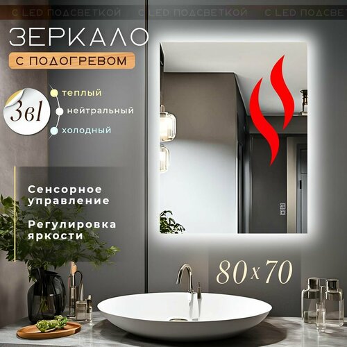 Зеркало с подсветкой и подогревом 3 в 1 для ванной прямоугольное с сенсорным управлением и регулировкой яркости 80 на 90 см