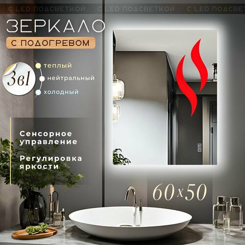 Зеркало с подсветкой и подогревом 3 в 1 для ванной прямоугольное с сенсорным управлением и регулировкой яркости 60 на 70 см