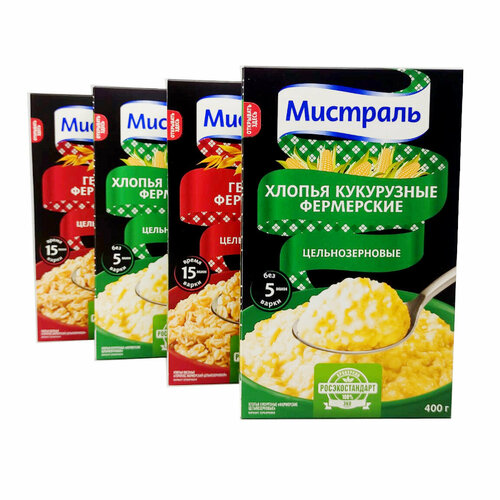 Хлопья Мистраль Фермерские цельнозерновые: Кукурузные (400 г * 2 шт) и Геркулес (400 г * 2 шт)