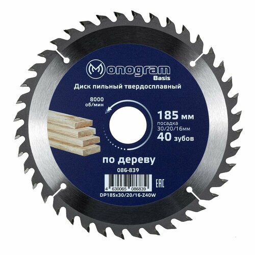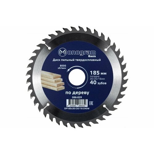 Диск пильный твердосплавный Basis (185х30/20/16 мм; 40 зубов) MONOGRAM 086-839