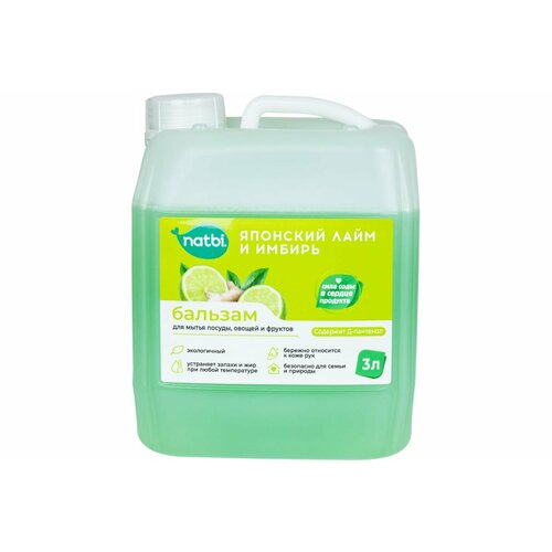 Безопасный для экологии бальзам для мытья посуды, фруктов и овощей NATBI Японский лайм и имбирь, с антибактериальным эффектом, 3 л. 5244