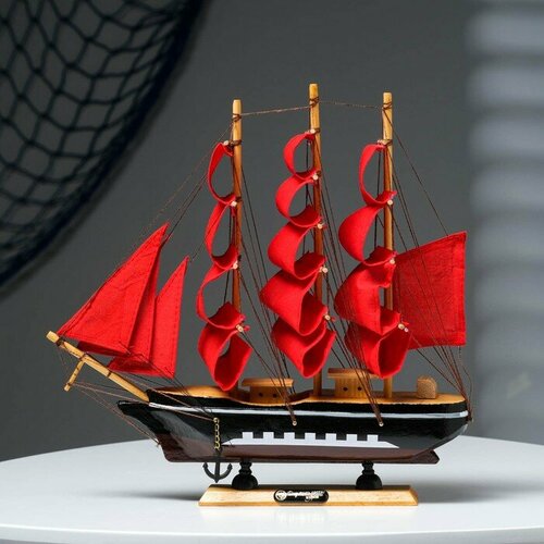 Корабль сувенирный средний «Флора», борта чёрные с белой полосой, паруса алые, 32х6,5х31 см
