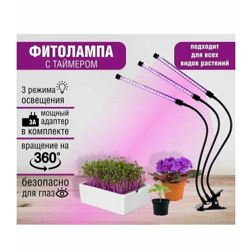 Фитолампа для растений и рассады. Лампа для растений светодиодная с адаптером и таймером отключения полный спектр 3х10 (40 Вт) на прищепке