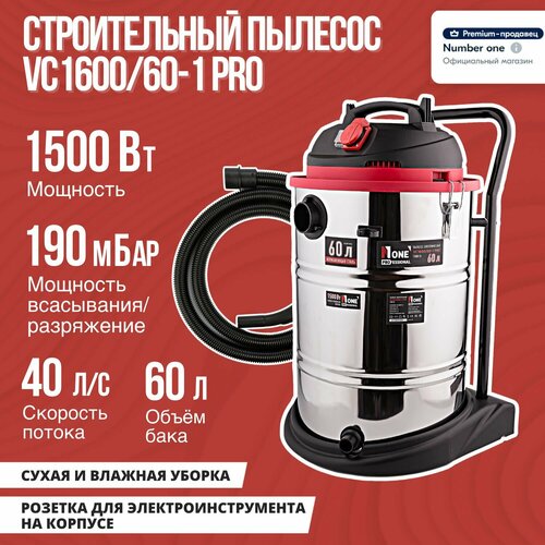 Строительный пылесос NUMBER ONE VC1600/60-1 PRO 60л, 1600Вт, 3м шланг, пылесборник.