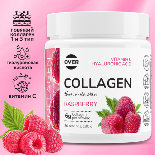 Коллаген порошок + витамин C + гиалуроновая кислота со вкусом малины, витамины для кожи волос и ногтей, 180 г, 30 порций
