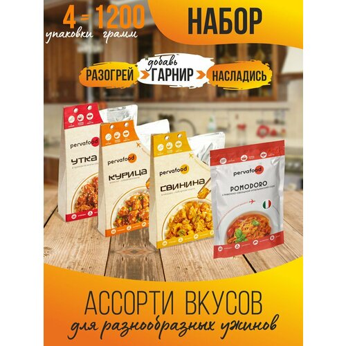 Мясные консервы Ассорти , готовые блюда Pervafood (свинина, курица, утка, карбонара)