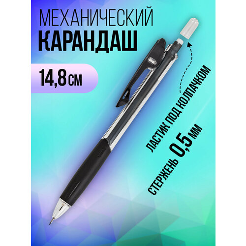 Карандаш механический 0,5 мм, с ластиком, резиновый грип черный