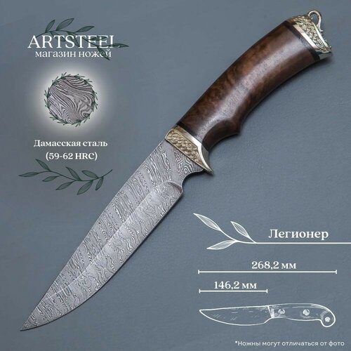 Нож туристический охотничий Легионер, Ворсма, дамасск, ореховый кап, литьё мельхиор