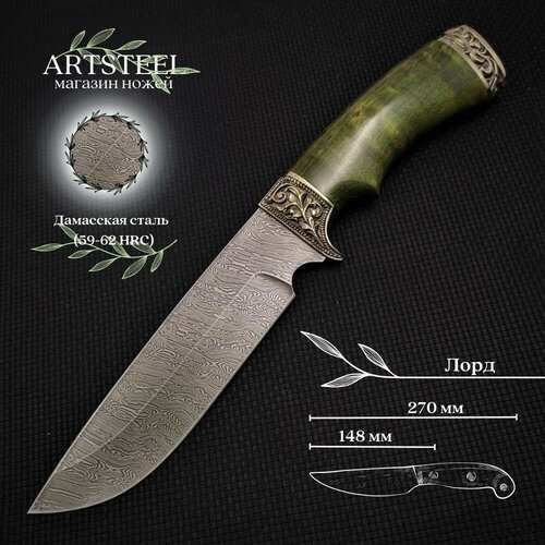 Нож туристический охотничий Лорд, Ворсма, дамасск, карельская береза, литьё мельхиор