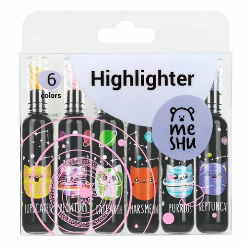 Набор текстовыделителей MESHU "Meowspace", 6цв, неоновые цвета, 1-5 мм, ПВХ бокс с европодвесом
