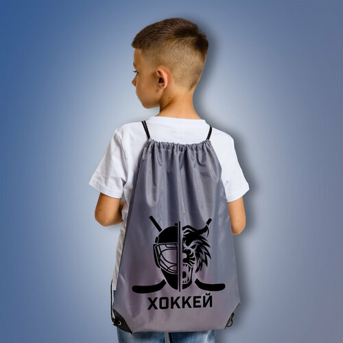 Сумка мешок для обуви с изображением хоккейной маски вратаря и надписью "Хоккей", серого цвета