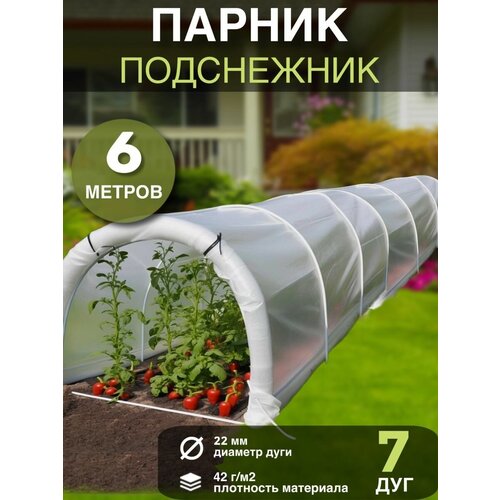 Парник из дуг с прошитым укрывным материалом для дачи Подснежник. Длина 6 м, ширина 120 см, высота 80 см. В комплектацию парника 6 м входят: Агроволокно плотностью 42 г/м2 - 1 шт; дуги ПНД (диаметр 20 мм) - 7 шт; колышки (длина 26 см, 6 см вставляются в дугу) - 15 шт; клипсы (диаметр 20 мм) - 15 шт; упаковочный пакет - 1 шт; инструкция - 1 шт.