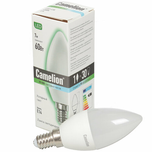 Лампа светодиодная E14, 7 Вт, 60 Вт, свеча, 4500 К, свет холодный белый, Camelion