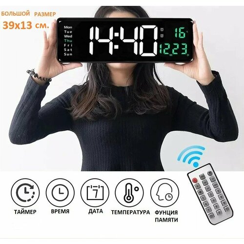 Настенные цифровые часы с дистанционным управлением Темп/ Дата/ День Недели/ будильник. Цыфры белые/зеленые.