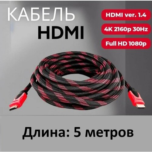 Кабель HDMI - HDMI (5м) с нейлоновой оплеткой, экранированием и позолоченными коннекторами 5 метров