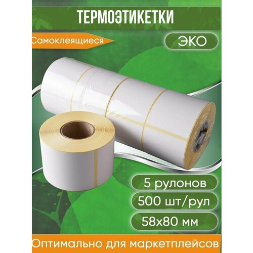 Термоэтикетки самоклеящиеся ЭКО, 58х80 мм, втулка 40 мм, 500 наклеек в ролике, упаковка 5 шт.
