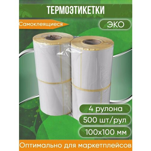 Термоэтикетки самоклеящиеся ЭКО, 100х100 мм, втулка 40 мм, 500 наклеек в ролике, упаковка 4 шт.