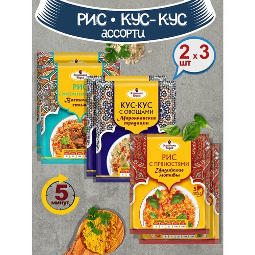 Каша в пакетиках, быстрого приготовления ассорти: кус-кус с овощами, рис с мясом и овощами, рис с пряностями 3 вида по 2 пакетика
