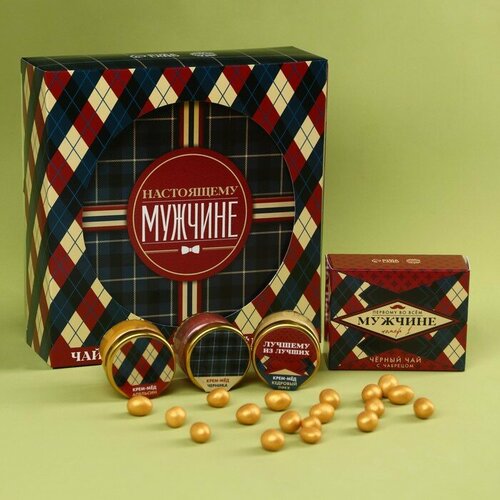 Подарочный набор «Настоящему мужчине»: чай чёрный с чабрецом 20 г, арахис в шоколаде 100 г, крем-мёд: с кедровым орехом, с черникой, с апельсином 90 г (3 шт. х 30 г).
