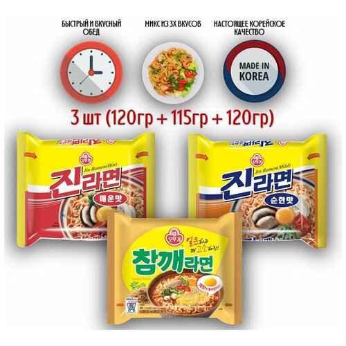 Ottogi Лапша быстрого приготовления, Корея, микс 3 вкусов (Джин Рамен Острый, Джин Рамен Среднеострый, Чамке Рамен)