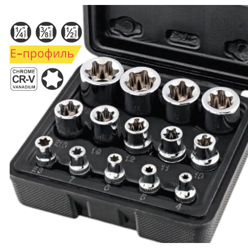 Набор головок звездочек 14 шт, торцевые головки для автомобиля набор Е-профиль ,1/4, 1/2, 3/8