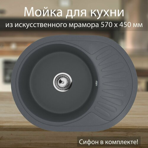 Мойка для кухни врезная из мрамора 570 х 450 мм со сливной арматурой, антрацит / Раковина для кухни Ulgran