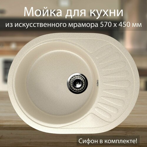 Кухонная мойка врезная из мрамора 570 х 450 мм со сливной арматурой, бежевая / Раковина для кухни Ulgran
