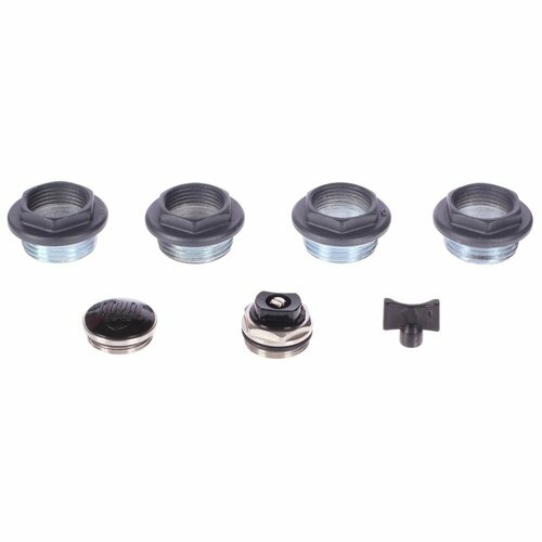 Комплектацияпереходник 1" х 1/2" левый – 2 шт, переходник 1" х 1/2" правый – 2 шт, воздухоотводчик (клапан маевского) – 1 шт, заглушка – 1 шт, ключ для воздухоотводчика – 1 шт.