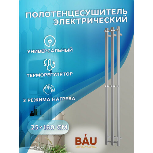 Полотенцесушитель дизайнерский электрический, профильный BAU Stella Square 12х160, 3 коллектора, 2 крючка, нерж. сталь полированная