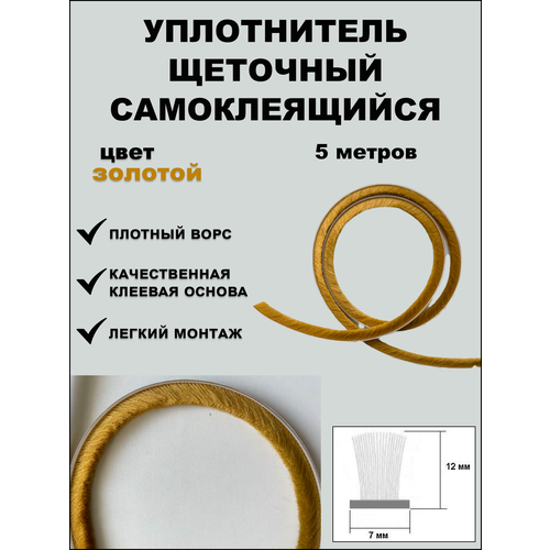 Щеточный уплотнитель (шлегель) самоклеящийся 7х12мм (длина ворса 12 мм) золотой 5 метров