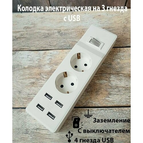 Колодка электрическая на 2 гнезда с выключателем и USB