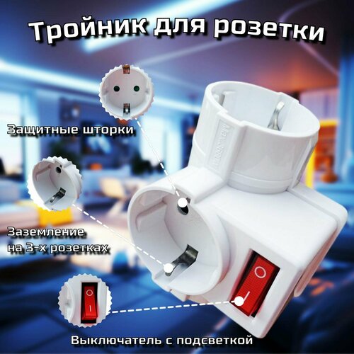 Тройник-адаптер разветвитель электрический с выключателем и подсветкой 3 гнезда